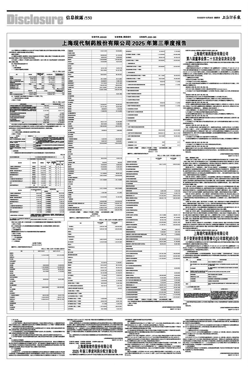 上海现代制药股份有限公司(以下简称公司)第八届董事会第二十五次会议,于2025年10月29日在上海市浦东新区建陆路378号以现场结合视频会议的方式召开。本次会议的通知和会议资料已于2025年10月19日以电子邮件方式发出。本次会议应参会董事8名,实际参会董事8名。会议由董事长许继辉先生主持,公司部分高级管理人员列席了会议。本次会议的召集和召开程序符合《公司法》和《公司章程》的有关规定,会议合法有效。