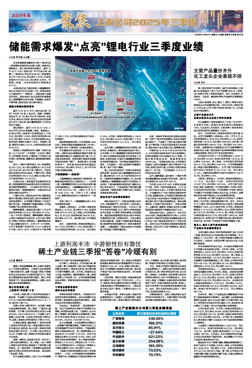 在全球储能需求爆发的引领下,锂电行业三季报营收利润均同比回暖,且第三季度同比增幅更大。据上海证券报记者统计,截至10月30日16时,电池行业(申万行业分类)披露了三季报的公司共有89家,前三季度营收合计为7796亿元,同比增长13.50%;归母净利润合计为682亿元,同比增长32.86%。单看第三季度,归母净利润同比增幅高达55.41%。