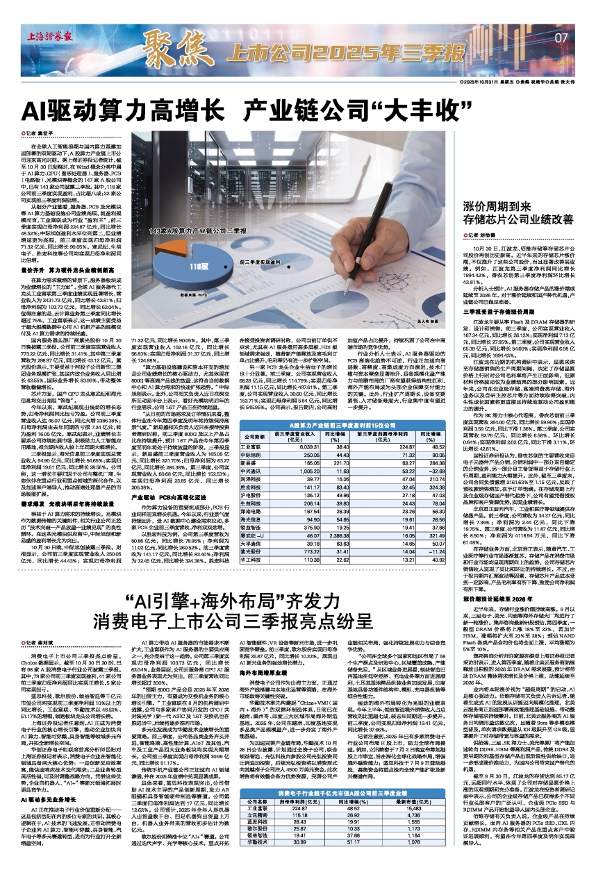 10月30日,江波龙、佰维存储等存储芯片公司股价再创历史新高。近半年来的存储芯片涨价潮,不仅推升了这些公司股价,而且显著改善其业绩。例如,江波龙第三季度净利润同比增长1994.42%,香农芯创第三季度净利润环比增长42.81%。