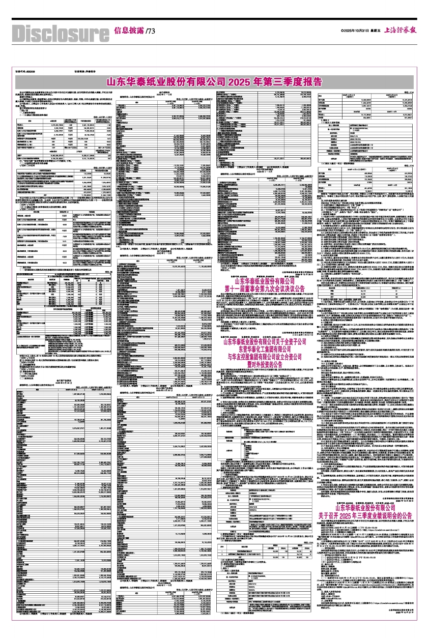 山东华泰纸业股份有限公司(下称“公司”或“华泰股份”)第十一届董事会第九次会议通知于2025年10月20日以专人送达及传真的方式下发给公司9名董事。会议于2025年10月30日以现场与通讯相结合的方式召开。会议应表决董事9人,实际表决董事9人,公司全体高管人员列席了会议,会议召开符合《公司法》和《公司章程》的有关规定,所做的决议合法有效。会议由李晓亮董事长主持,经过充分讨论,审议通过了如下议案: