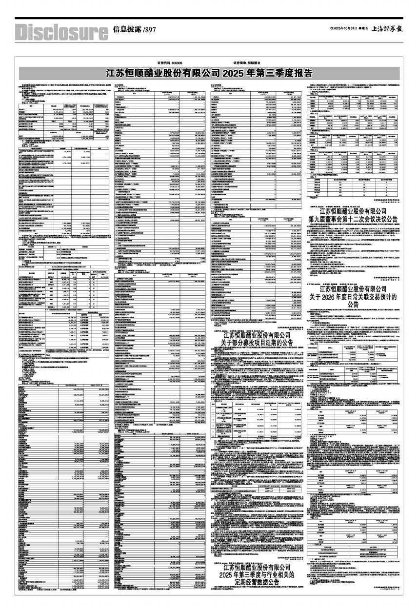 具体内容详见同日披露于上海证券交易所网站(www.sse.com.cn)上的《江苏恒顺醋业股份有限公司2025年第三季度报告》。