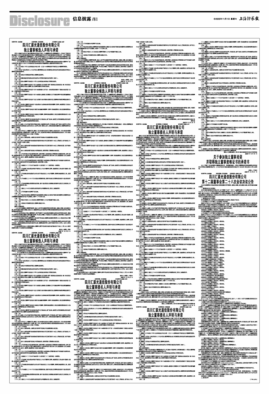 提名人四川汇源光通信股份有限公司董事会现就提名邓路为四川汇源光通信股份有限公司第 13 届董事会独立董事候选人发表公开声明。被提名人已书面同意作为四川汇源光通信股份有限公司第 13 届董事会独立董事候选人(参见该独立董事候选人声明)。本次提名是在充分了解被提名人职业、学历、职称、详细的工作经历、全部兼职、有无重大失信等不良记录等情况后作出的,本提名人认为被提名人符合相关法律、行政法规、部门规章、规范性文件和深圳证券交易所业务规则对独立董事候选人任职资格及独立性的要求,具体声明并承诺如下事项: