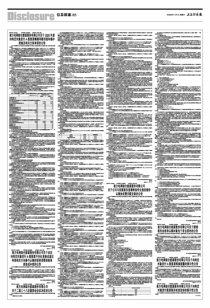 南方电网综合能源股份有限公司(以下简称“公司”)于2025年10月31日召开公司二届三十八次董事会会议,审议通过了公司2025年度向特定对象发行A股股票的相关议案。具体内容详见公司于2025年11月1日在巨潮资讯网(http://www.cninfo.com.cn)披露的《南方电网综合能源股份有限公司2025年度向特定对象发行A股股票预案》等文件。