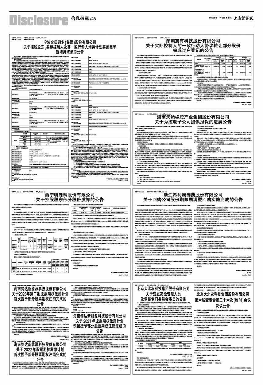 2025年11月4日,公司接到宁波震有的通知,本次协议转让已在中国证券登记结算有限责任公司办理完成过户登记手续,并取得中国证券登记结算有限责任公司出具的《证券过户登记确认书》,过户日期为2025年11月3日,过户数量为9,630,000股,股份性质为无限售流通股。