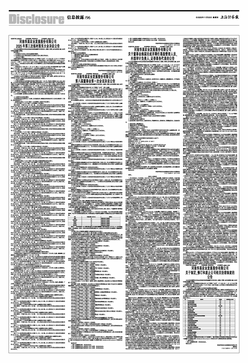河南华英农业发展股份有限公司(以下简称“公司”)于2025年11月19日召开第八届董事会第一次会议审议通过了《关于制定、修订和废止公司部分内部治理制度的议案》。现将具体情况公告如下: