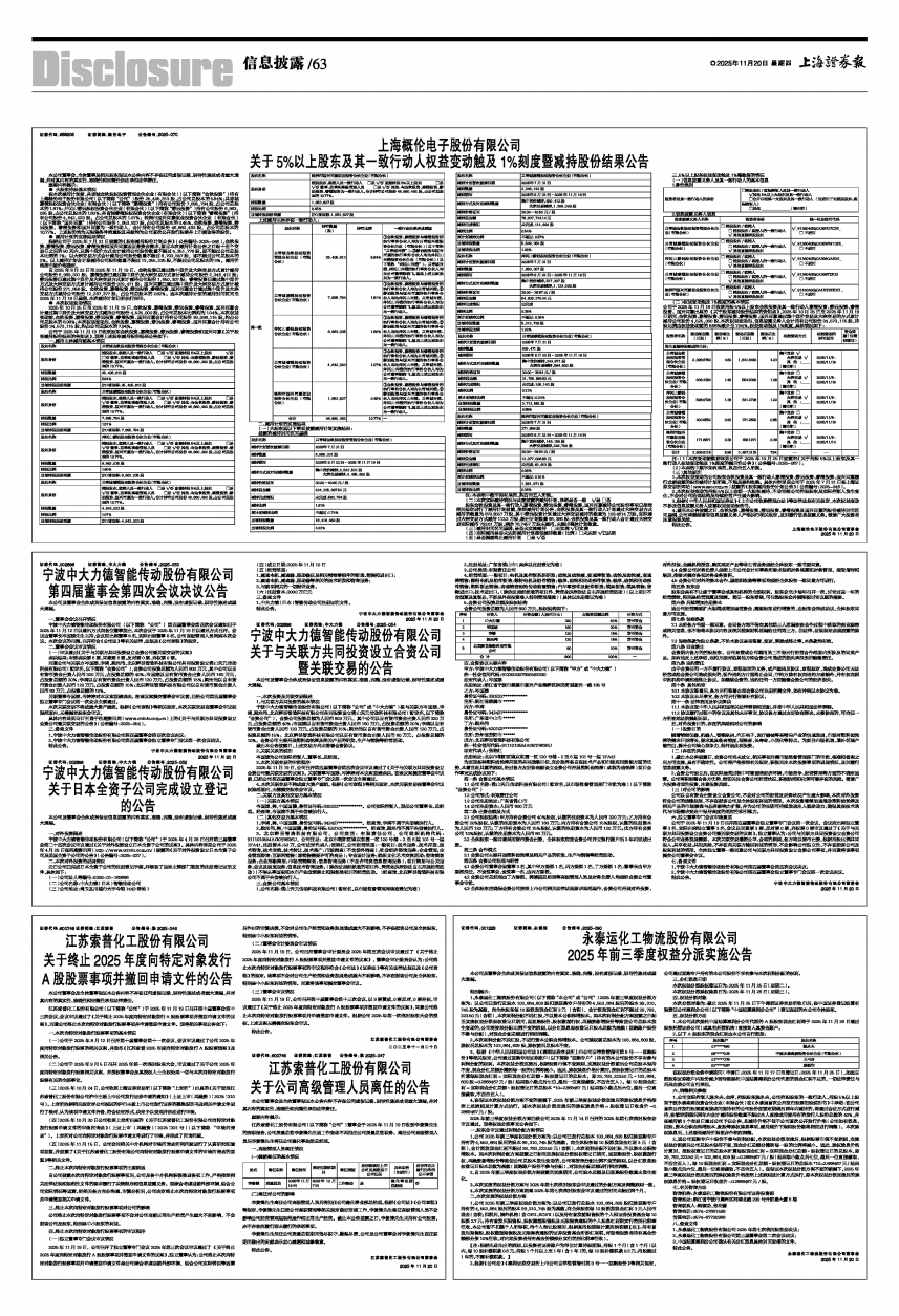 1、永泰运化工物流股份有限公司(以下简称“本公司”或“公司”)2025年前三季度权益分派方案为:以公司已发行总股本103,864,609股扣除回购专户持有的4,553,864股后的股本99,310,745股为基数,向全体股东每10股派发现金红利3元(含税),合计派发现金红利不超过29,793,223.50元(含税),本次利润分配不送红股,不以资本公积转增股本。如本次利润分配方案披露之日起至实施权益分派股权登记日期间,因回购股份、股权激励行权、再融资新增股份等致使公司总股本发生变动的,公司将按照分配比例不变的原则,以分红派息股权登记日股本总数为基数(回购账户股份不参与分配),对现金分配总额进行相应调整。