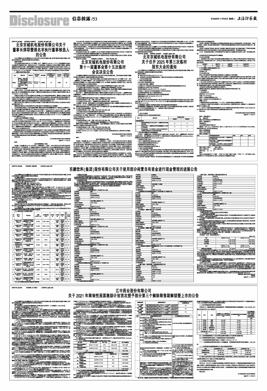 根据2025年11月21日发出的会议通知,北京京城机电股份有限公司(以下简称“公司”)第十一届董事会(以下简称“董事会”)第十五次临时会议于2025年11月24日以现场及通讯方式召开。应出席会议的董事10名,实际出席会议的董事10名。公司监事、高级管理人员列席了会议。会议召开符合所有适用法律和《公司章程》的规定。