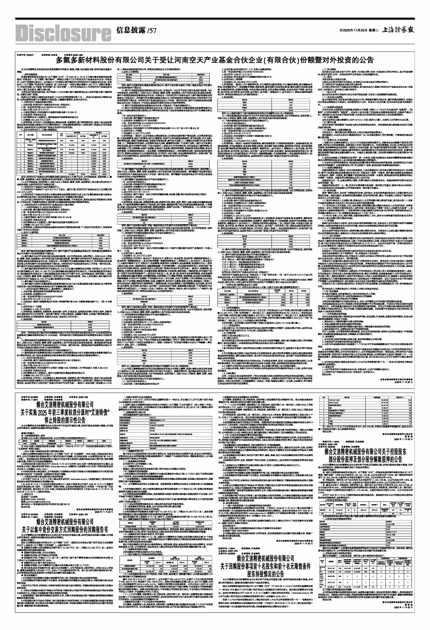 多氟多新材料股份有限公司(以下简称“公司”)于2025年11月24日与焦作通财创新创业投资基金(有限合伙)(以下简称“焦作通财”)等相关方签订《关于河南空天产业基金合伙企业(有限合伙)之财产份额转让协议》。公司拟以0元价格受让焦作通财持有的河南空天产业基金合伙企业(有限合伙)(以下简称“河南空天产业基金”或“合伙企业”)对应认缴出资额6,000万元(实缴出资额0元)的合伙份额(以下简称“标的份额”或“合伙份额”),并作为有限合伙人与河南空天产业基金其他合伙人签订合伙协议,履行出资义务。