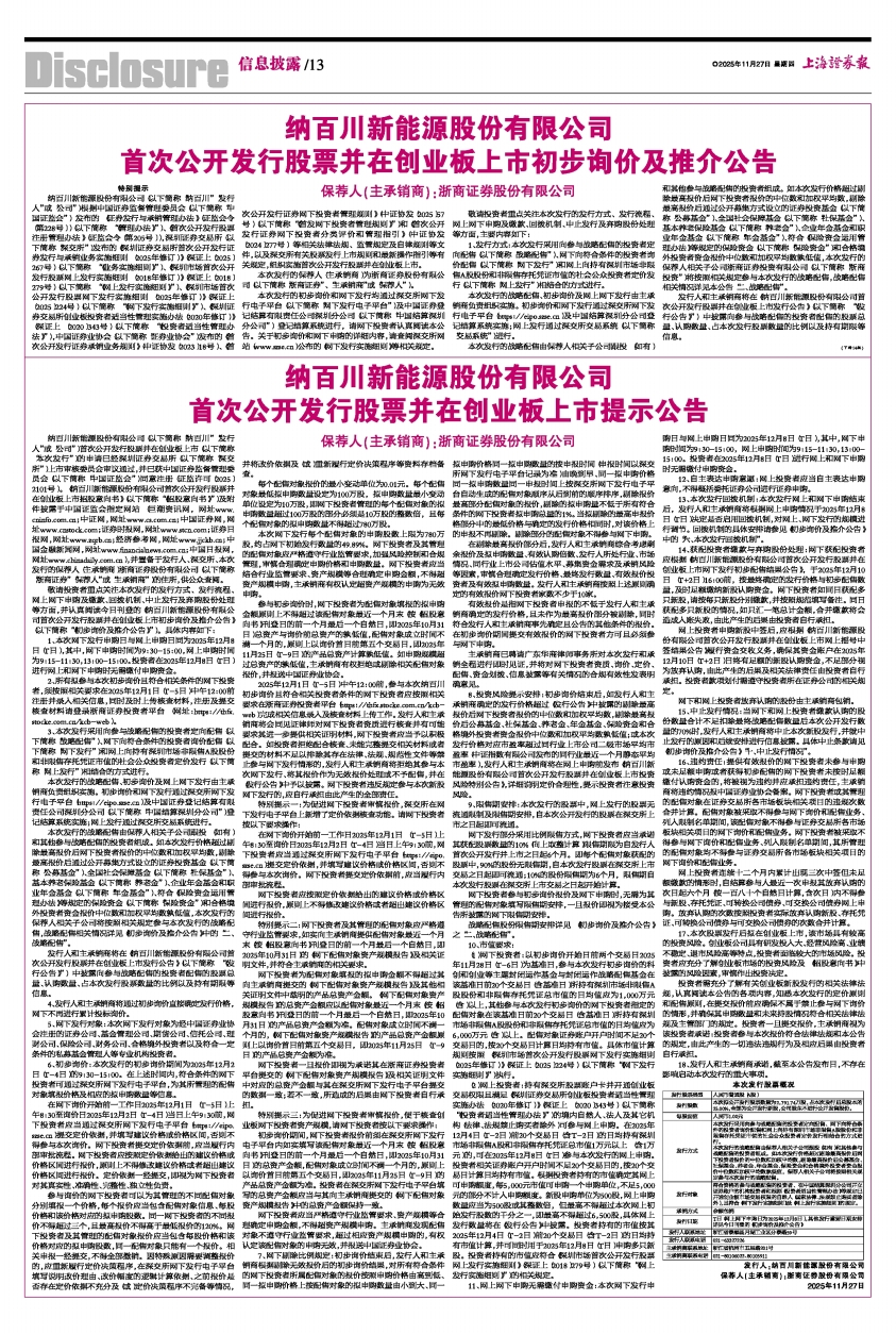 纳百川新能源股份有限公司(以下简称“纳百川”“发行人”或“公司”)首次公开发行股票并在创业板上市(以下简称“本次发行”)的申请已经深圳证券交易所(以下简称“深交所”)上市审核委员会审议通过,并已获中国证券监督管理委员会(以下简称“中国证监会”)同意注册(证监许可〔2025〕2101号)。《纳百川新能源股份有限公司首次公开发行股票并在创业板上市招股意向书》(以下简称“《招股意向书》”)及附件披露于中国证监会指定网站(巨潮资讯网,网址www.cninfo.com.cn;中证网,网址www.cs.com.cn;中国证券网,网址www.cnstock.com;证券时报网,网址www.stcn.com;证券日报网,网址www.zqrb.cn;经济参考网,网址www.jjckb.cn;中国金融新闻网,网址www.financialnews.com.cn;中国日报网,网址www.chinadaily.com.cn),并置备于发行人、深交所、本次发行的保荐人(主承销商)浙商证券股份有限公司(以下简称“浙商证券”“保荐人”或“主承销商”)的住所,供公众查阅。