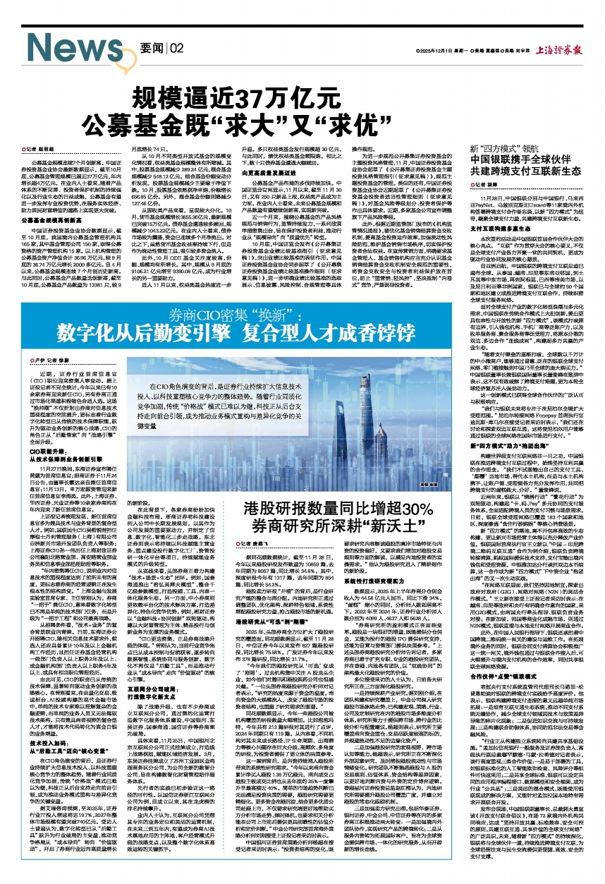 公募基金规模连续7个月创新高。中国证券投资基金业协会最新数据显示,截至10月底,公募基金管理规模已逼近37万亿元,年内增长超4万亿元。在业内人士看来,随着产品体系的不断完善、投资者保护机制的持续强化以及行业生态的日益成熟,公募基金有望进一步发挥专业投资优势,在服务实体经济、助力居民财富增值的道路上实现更大突破。
