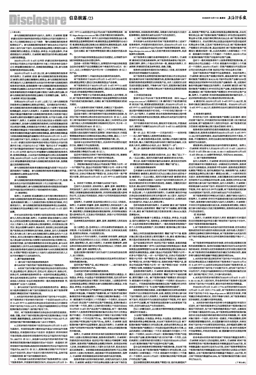 7、若配售对象类型为基金公司或其资产管理子公司一对一专户理财产品、基金公司或其资产管理子公司一对多专户理财产品、证券公司定向资产管理计划、证券公司限额特定资产管理计划、证券公司集合资产管理计划、证券公司单一资产管理计划等,须在2025年12月15日(T-4日)中午12:00前完成备案。