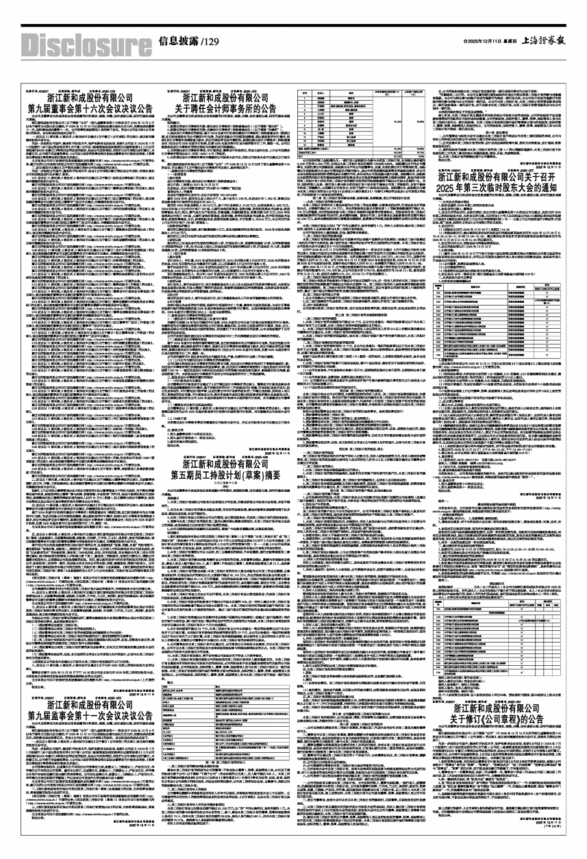 浙江新和成股份有限公司(以下简称“公司”)第九届董事会第十六次会议于2025年12月5日以电子邮件方式发出会议通知,于2025年12月10日以现场结合通讯表决方式召开。应参加表决董事十一名,实际参加表决董事十一名。公司监事和高级管理人员列席了会议。符合《公司法》和《公司章程》的规定。会议经表决形成决议如下: