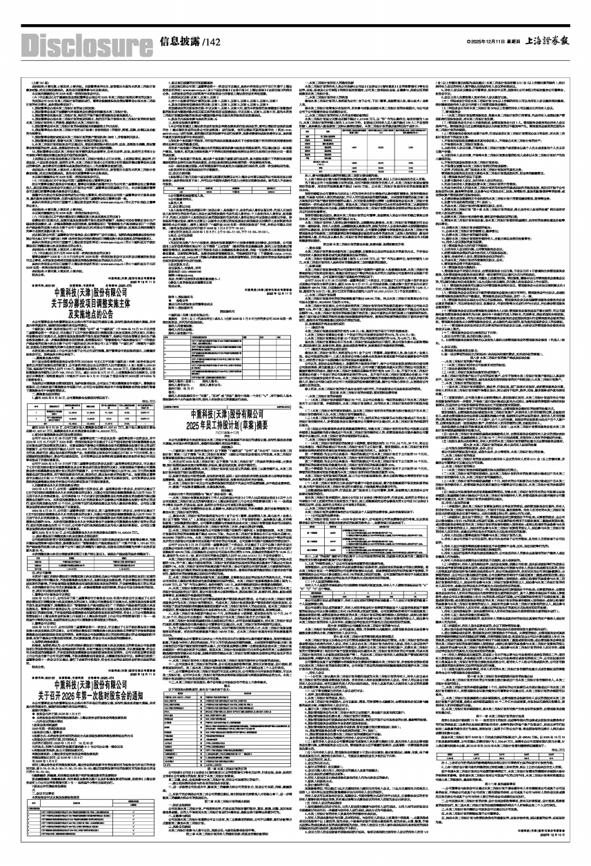 中重科技(天津)股份有限公司(以下简称“公司”或“中重科技”)于2025年12月10日召开第二届董事会第十一次会议,审议通过了《关于部分募投项目调整实施主体及实施地点的议案》,同意公司在募投项目实施方式、投资用途及投资规模不发生变更的前提下,根据公司冶金智能自动化生产线业务发展需求,进一步提高募集资金使用效率,拟将募投项目“智能装备生产基地建设项目”中的部分产线设备的实施主体由全资子公司中重科技(江苏)有限公司(以下简称“中重江苏”)调整为中重科技;实施地点相应调整为天津市北辰区高新大道65号。