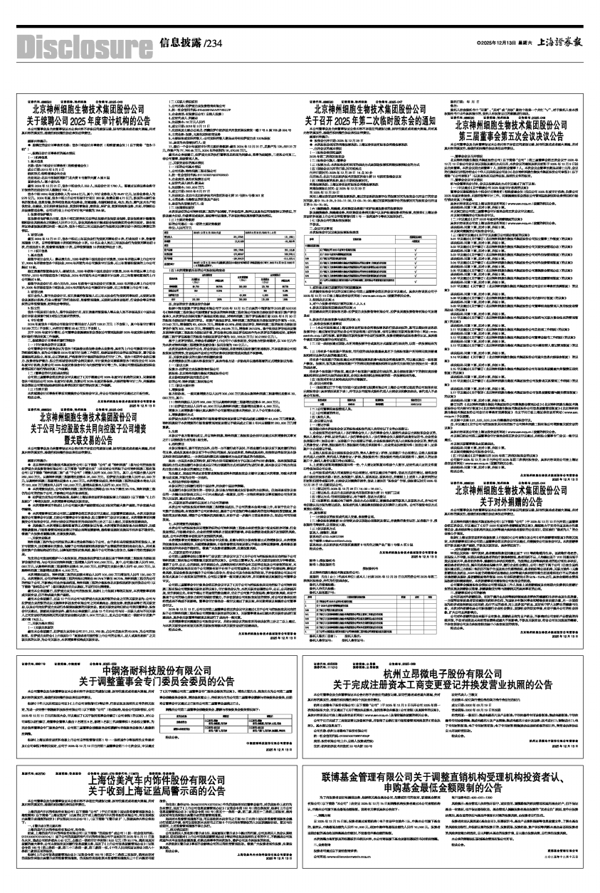北京神州细胞生物技术集团股份公司(以下简称“公司”)第三届董事会第五次会议于2025年12月12日在公司会议室以现场及通讯方式召开,本次会议的通知及相关材料于2025年12月9日送达全体董事。本次会议应出席董事7人,实际到会董事7人。本次会议由董事长谢良志博士主持,会议的召集和召开程序符合《中华人民共和国公司法》《北京神州细胞生物技术集团股份公司章程》(以下简称“《公司章程》”)以及其他有关法律法规、规范性文件的规定。