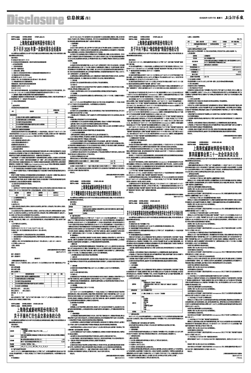 具体内容详见公司同日披露于上海证券交易所网站(www.sse.com.cn)的《上海海优威新材料股份有限公司关于召开2026年第一次临时股东会的通知》(公告编号:2025-073)。