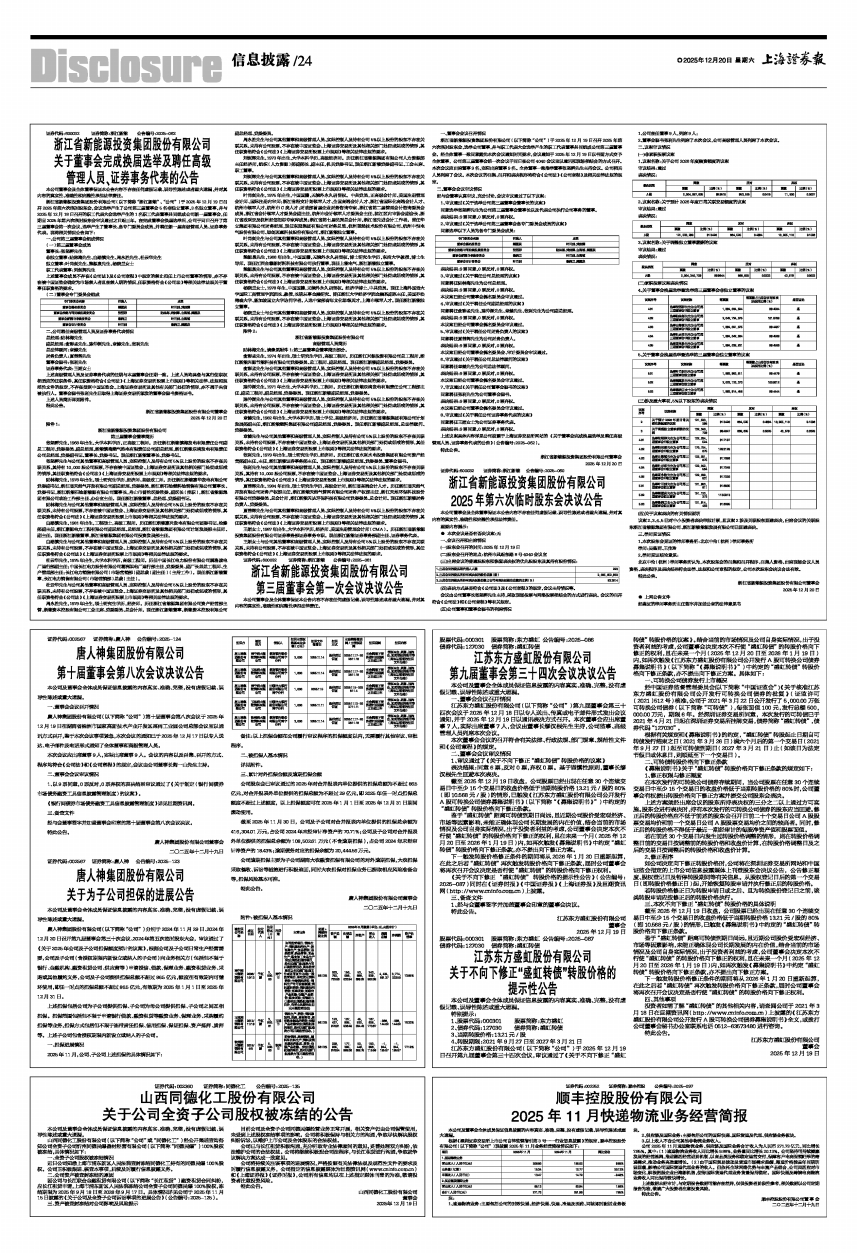 浙江省新能源投资集团股份有限公司(以下简称“浙江新能”、“公司”)于2025年12月19日召开2025年第六次临时股东会,会议选举产生了公司第三届董事会5名非独立董事、3名独立董事,并与2025年12月18日召开的职工代表大会选举产生的1名职工代表董事共同组成公司新一届董事会,任期自2025年第六次临时股东会审议通过之日起三年。在完成董事会换届选举后,公司于同日召开了第三届董事会第一次会议,选举产生了董事长、各专门委员会成员,并聘任新一届高级管理人员、证券事务代表。现将相关情况公告如下: