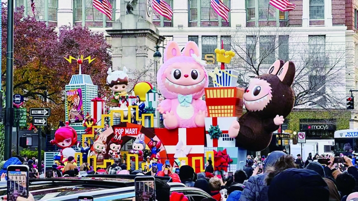 2025年11月,泡泡玛特携旗下多款超人气IP参与了位于美国纽约的梅西百货感恩节大游行,成为百年来首个以原创潮玩IP形象登上花车的中国品牌。活动现场,花车上的三只LABUBU明星朋友沿路与观众亲切互动,不时引来观礼人群的阵阵欢呼。