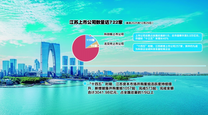 上市公司是区域经济发展的“顶梁柱”,也是科技创新和产业创新深度融合的“排头兵”。截至2025年12月29日,江苏上市公司数量达722家,占全国总量的1/8,总市值攀升至8.9万亿元,市值较“十三五”末增长46%。其中,千亿元市值公司增至11家,一批科技龙头上市公司脱颖而出。数据显示,江苏在科创板、北交所上市公司数量分别达115家、56家,稳居全国第一。此外,“十四五”时期,江苏上市公司实现首发融资2259.71亿元、再融资3852.79亿元,全国排名第四,为“经济大省挑大梁”提供了坚实支撑。