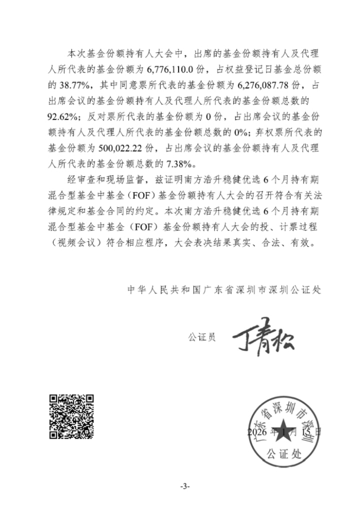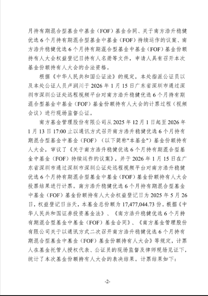 本次会议通过的表决事项为基金管理人于2025年12月1日刊登的《南方基金管理股份有限公司关于以通讯方式二次召开南方浩升稳健优选6个月持有期混合型基金中基金(FOF)基金份额持有人大会的公告》之附件《关于南方浩升稳健优选6个月持有期混合型基金中基金(FOF)持续运作的议案》。