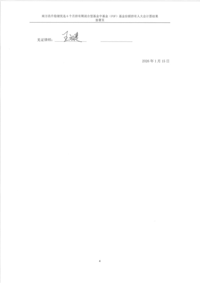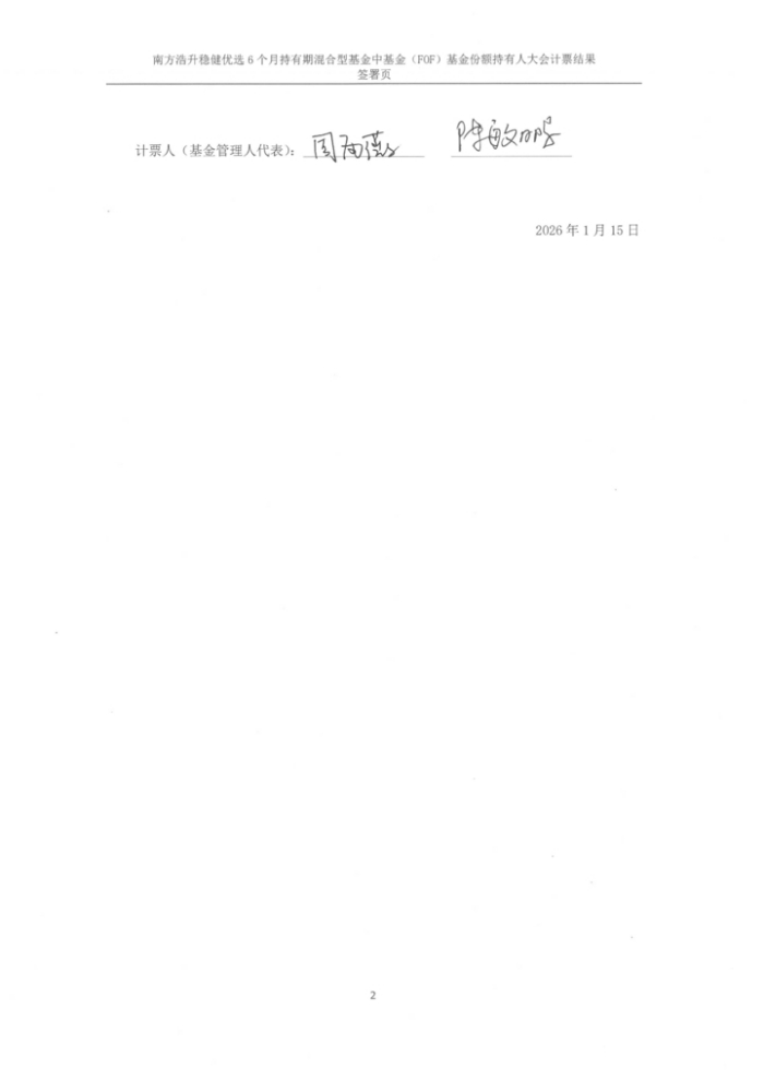 根据《中华人民共和国证券投资基金法》、《公开募集证券投资基金运作管理办法》和《南方浩升稳健优选6个月持有期混合型基金中基金(FOF)基金合同》(以下简称“基金合同”)的有关规定,现将南方浩升稳健优选6个月持有期混合型基金中基金(FOF)(以下简称“本基金”)二次召开基金份额持有人大会的决议及相关事项公告如下: