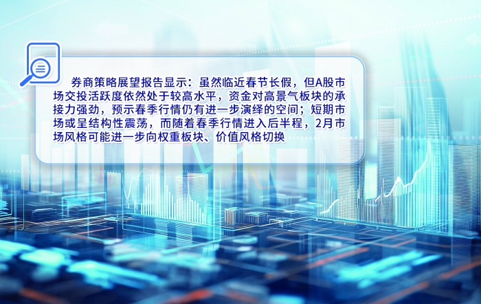 券商策略展望报告显示:虽然临近春节长假,但A股市场交投活跃度依然处于较高水平,资金对高景气板块的承接力强劲,预示春季行情仍有进一步演绎的空间;短期市场或呈结构性震荡,而随着春季行情进入后半程,2月市场风格可能进一步向权重板块、价值风格切换。
