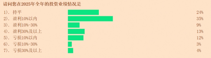 本期调查结果显示:在被问及2025年对收益贡献最大的板块时,26%的受访投资者选择以AI、芯片为代表的科技股,在所有选项中占比最高;24%的投资者将最大收益归于新能源产业链板块,位列第二;18%的投资者表示有色等周期板块收益贡献最大;另有12%的投资者表示银行、保险、券商等金融股是其主要收益来源。