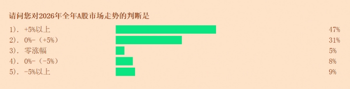 展望2026年,认为全年股市将上涨的个人投资者占比为78%,为自2022年以来年度调查结果中的最高点。其中,认为涨幅在5%以上的投资者占比为47%,认为涨幅介于0%至5%之间的投资者占比为31%。