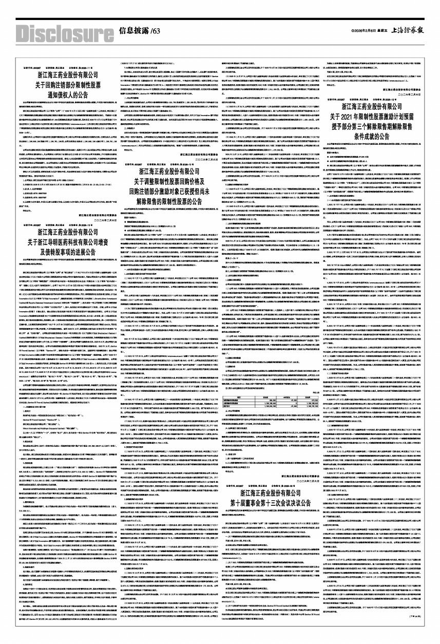 详见《浙江海正药业股份有限公司关于2021年限制性股票激励计划预留授予部分第三个解除限售期解除限售条件成就的公告》,已登载于2026年2月6日的《中国证券报》《上海证券报》《证券时报》和上海证券交易所网站(www.sse.com.cn)上。