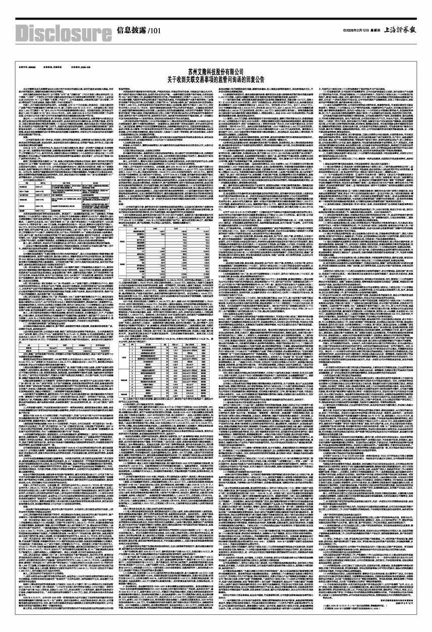 苏州艾隆科技股份有限公司(以下简称“公司”或“艾隆科技”)于近日收到上海证券交易所(以下简称“上交所”)下发的《关于苏州艾隆科技股份有限公司关联交易事项的监管工作函》(上证科创公函[2026]0055号)(以下简称“《监管工作函》”),公司高度重视,并组织相关部门对《监管工作函》事项进行了分析及核查,现就《监管工作函》回复如下:
