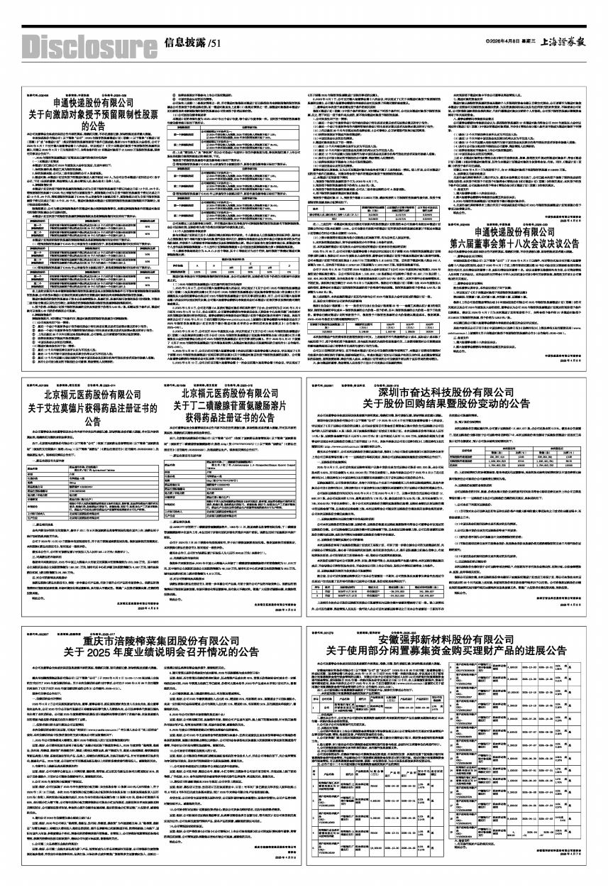 申通快递股份有限公司(以下简称“公司”)2025年限制性股票激励计划(草案)(以下简称“《激励计划(草案)》”或“本激励计划”)规定的限制性股票预留授予条件已经成就,根据2024年度股东大会授权,公司于2026年4月7日召开第六届董事会第十八次会议,审议通过了《关于向激励对象授予预留限制性股票的议案》,同意以2026年4月7日为预留授予日,向符合条件的37名激励对象授予312.8623万股限制性股票。现将有关事项公告如下: