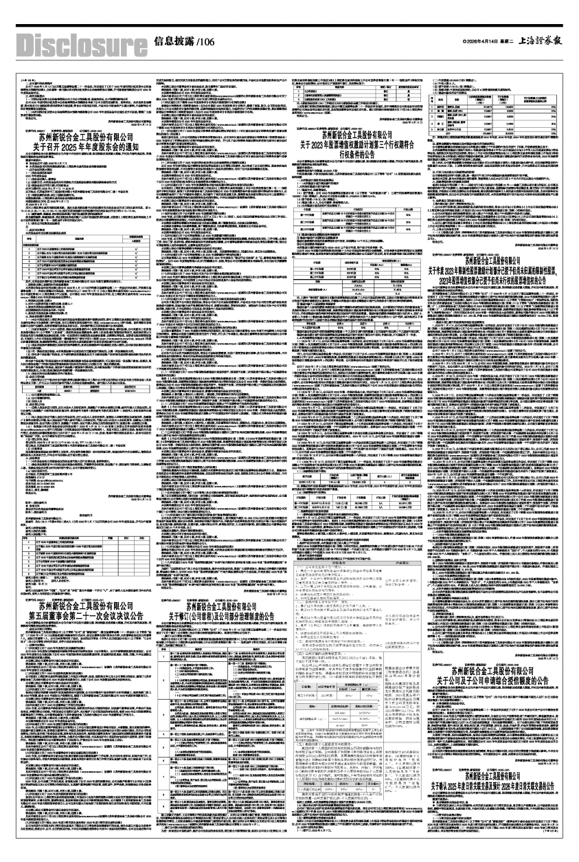苏州新锐合金工具股份有限公司(以下简称“公司”或“新锐股份”)董事会审计委员会会议审议通过了《关于确认2025年度日常关联交易及预计2026年度日常关联交易的议案》,并同意提交该议案至公司董事会审议。2026年4月13日,公司召开第五届董事会第二十一次会议审议通过了《关于确认2025年度日常关联交易及预计2026年度日常关联交易的议案》,审议程序符合相关法律法规的规定。(下转107版)