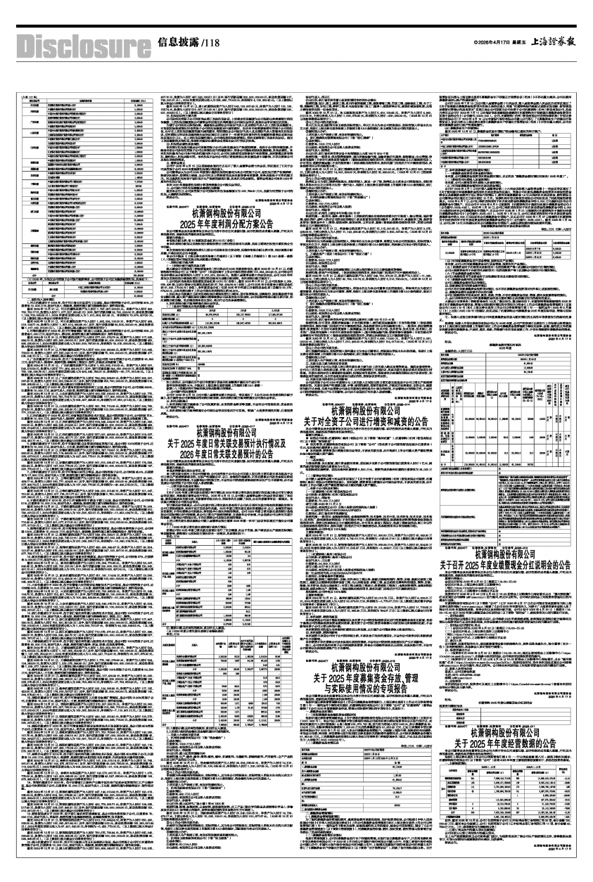 杭萧钢构股份有限公司(以下简称“公司”)已于2026年4月17日在公司指定信息披露报刊和上海证券交易所网站(www.sse.com.cn)披露了《公司2025年年度报告》。为便于广大投资者更全面深入地了解公司2025年度经营成果、财务状况以及利润分配方案,公司计划于2026年4月29日(星期三)14:00-15:00召开2025年度业绩暨现金分红说明会(以下简称“说明会”),就投资者关心的问题进行交流。