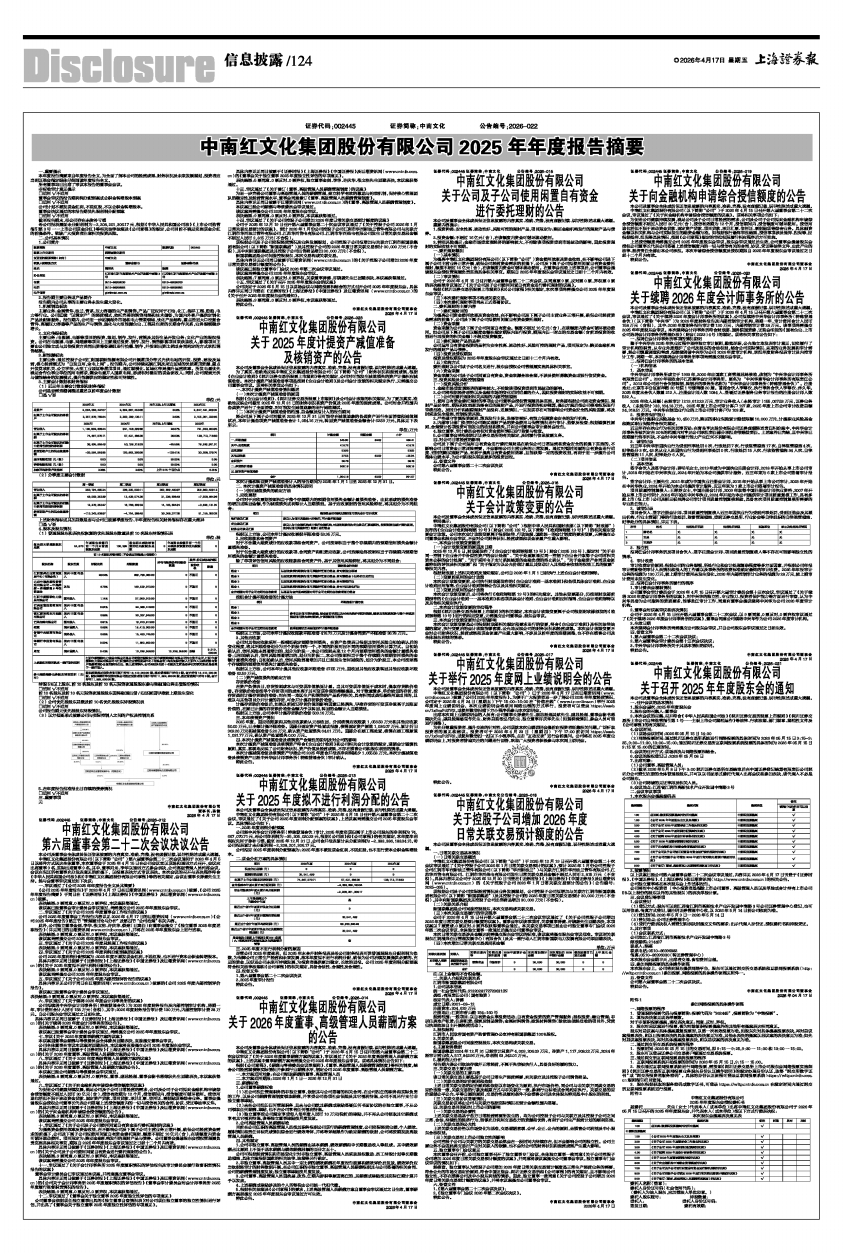 中南红文化集团股份有限公司(以下简称“公司”)第六届董事会第二十二次会议通知于2026年4月5日以邮件方式送达全体董事,本次董事会于2025年4月15日在公司会议室以现场和通讯方式召开,会议应出席董事9名,实际出席董事9名,其中,董事刘龙、李华以通讯方式参会表决,公司高级管理人员列席会议,会议在保证所有董事充分发表意见的前提下,以投票表决方式审议表决。本次会议的召开与表决程序符合《中华人民共和国公司法》和《中南红文化集团股份有限公司章程》等的有关规定,会议由董事长薛健先生主持。经与会董事审议通过如下决议: