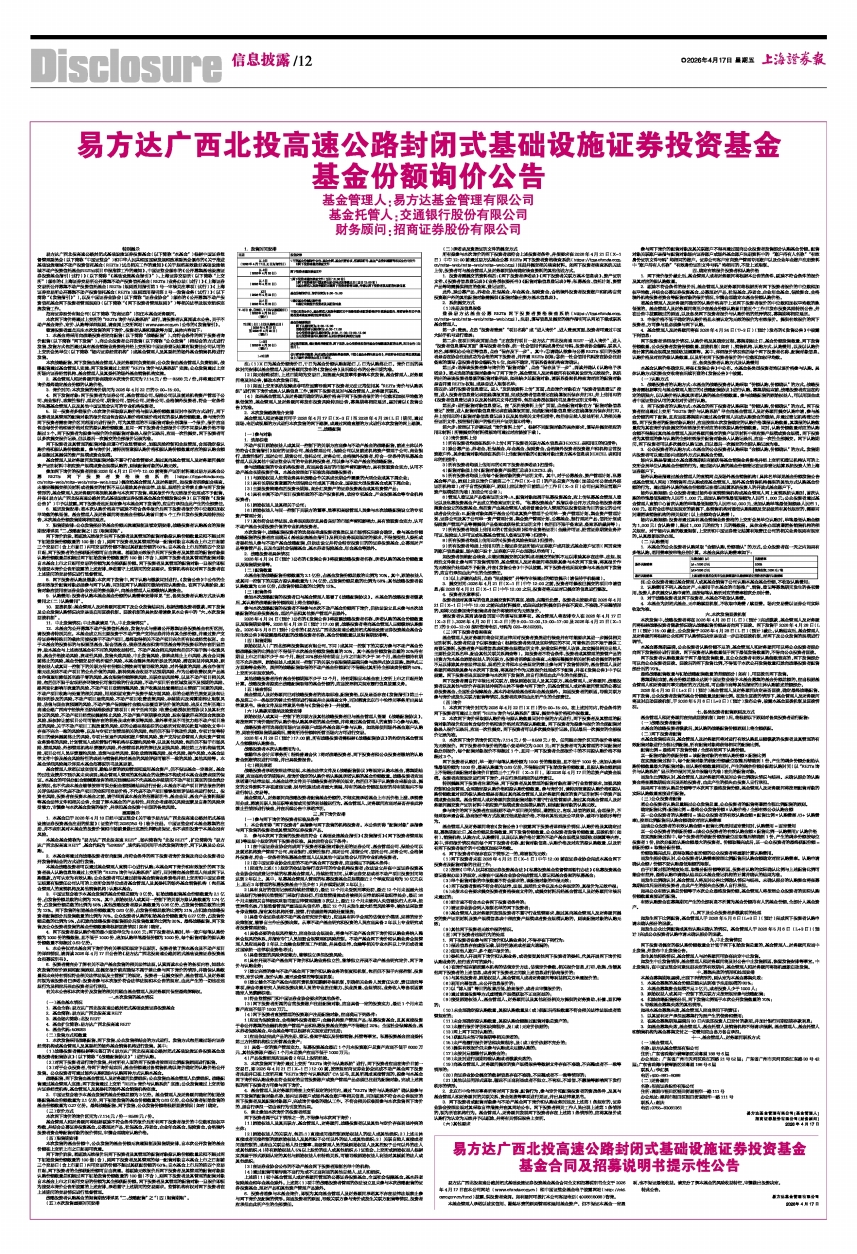 5.本公告仅对本基金网下询价的有关事项和规定予以说明。投资者欲了解本基金及不动产项目的详细情况,请阅读2026年4月17日公告的《易方达广西北投高速公路封闭式基础设施证券投资基金招募说明书》。