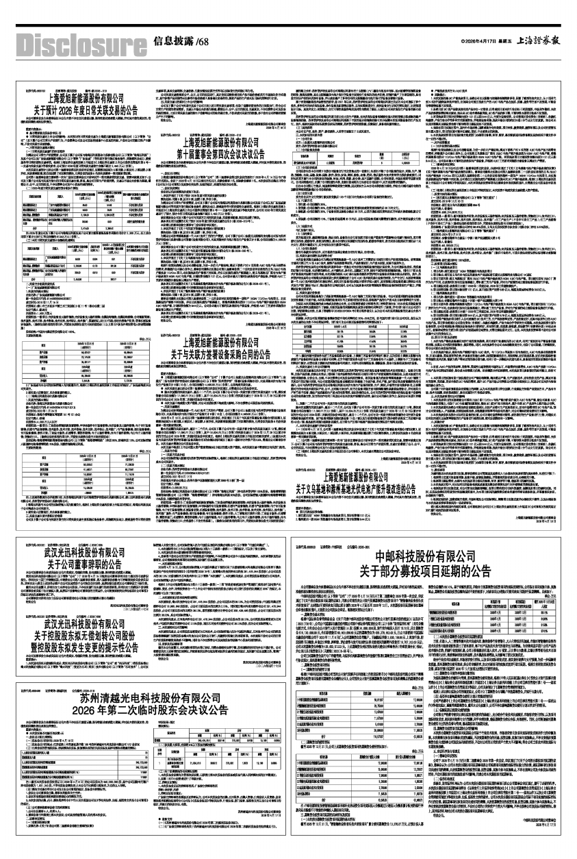上海爱旭新能源股份有限公司(以下简称“公司”)第十届董事会第四次会议的通知于2026年4月14日以电子邮件方式送达。会议于2026年4月16日以通讯方式召开,应参会董事7名,实际参会董事7名。本次会议的召集召开符合《公司法》《公司章程》及其他有关法律、法规的规定,形成的决议合法有效。