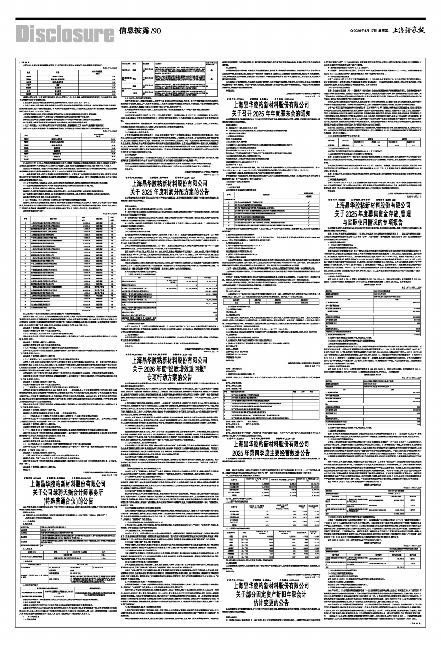 根据上海证券交易所《上海证券交易所上市公司自律监管指引第3号行业信息披露:第十三号一一化工》的要求,现将上海晶华胶粘新材料股份有限公司(以下简称“公司”)2025年第四季度主要经营数据披露如下(均不含税):