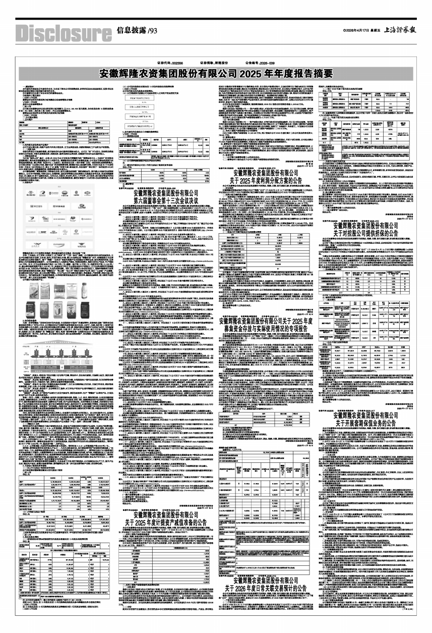 安徽辉隆农资集团股份有限公司(下称“公司”)第六届董事会第十三次会议通知于2026年4月3日以送达和通讯方式发出,并于2026年4月15日在公司会议室以现场的方式召开。会议由公司董事长程诚女士主持,本次会议应到9位董事,实到9位董事。会议的召开符合《公司法》和《公司章程》的有关规定,会议通过以下议案: