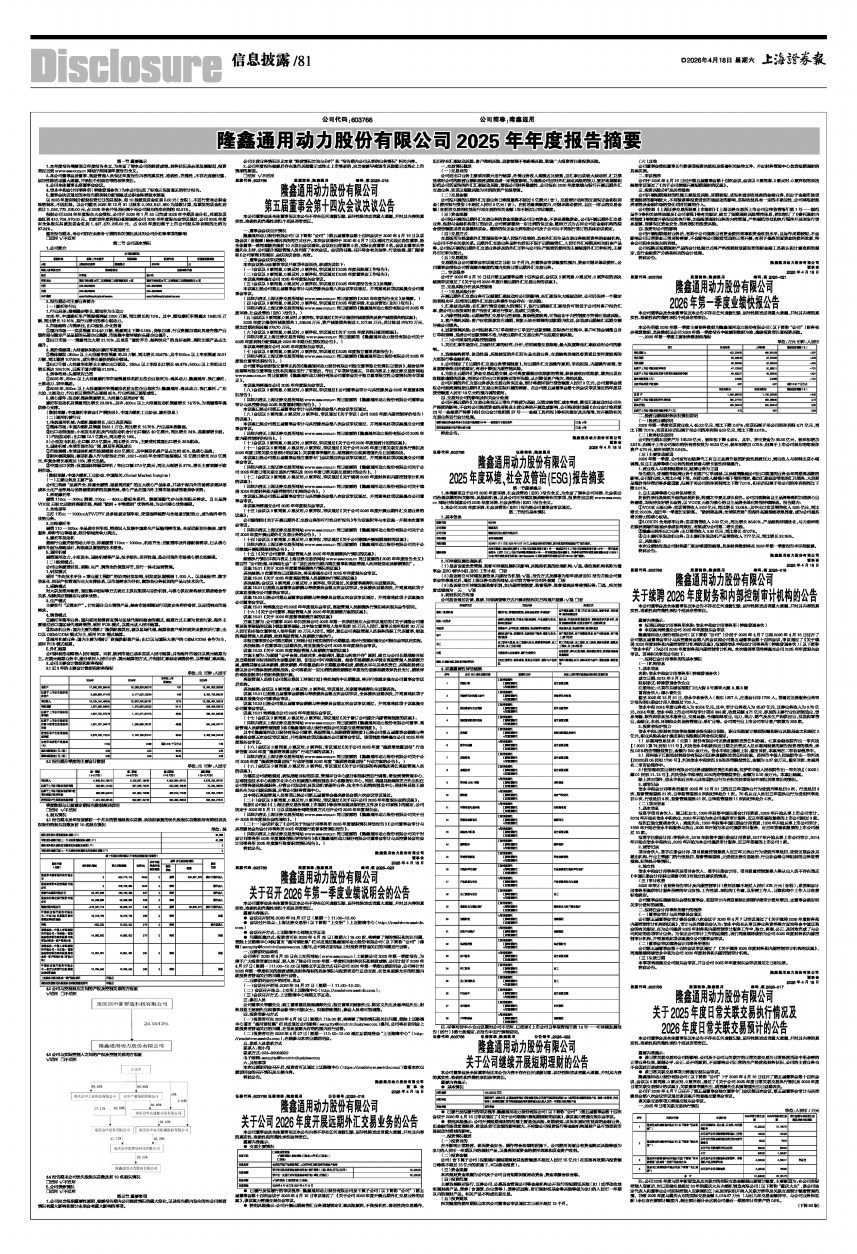 隆鑫通用动力股份有限公司(以下简称“公司”)第五届董事会第十四次会议于2026年4月16日以现场会议(含视频)结合通讯表决的方式召开。本次会议通知于2026年4月7日以通讯方式送达各位董事,经全体董事一致同意豁免提前10天发出会议通知。会议应出席董事9名,实际出席董事9名。会议由董事长李耀先生主持,公司部分高级管理人员列席了本次会议。会议的召集、召开符合有关法律、行政法规、部门规章和《公司章程》的规定,会议决议合法、有效。