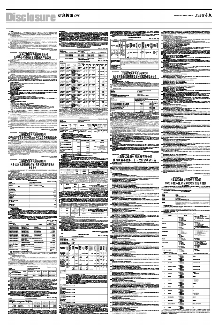 具体内容详见公司同日披露于上海证券交易所网站(www.sse.com.cn)的《上海海优威新材料股份有限公司2025年年度报告》及《上海海优威新材料股份有限公司2025年年度报告摘要》。