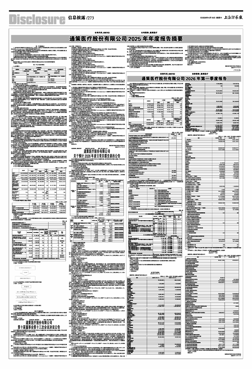 具体内容详见公司同日在上海证券交易所网站(www.sse.com.cn)披露的《通策医疗股份有限公司2026年第一季度报告》。