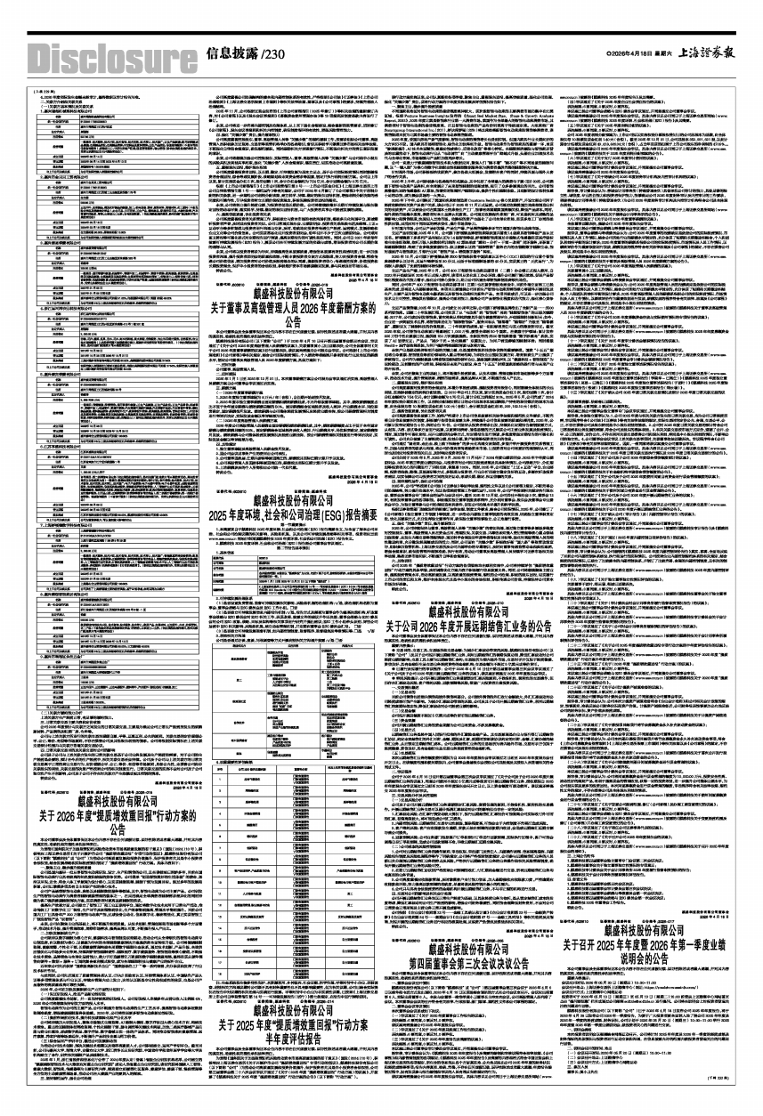 该议案尚需提请公司2025年年度股东会审议。具体内容详见公司同日于上海证券交易所网站(www.sse.com.cn)披露的《麒盛科技2025年年度报告》及其摘要。