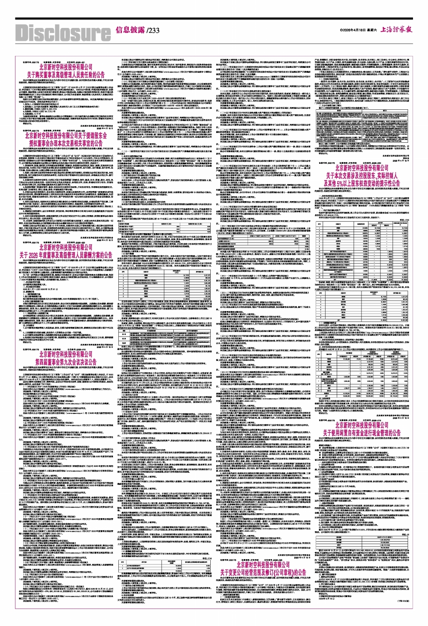 北京新时空科技股份有限公司(以下简称“公司”)于2026年4月17日召开第四届董事会第九次会议,审议通过了《关于〈2026年度公司董事薪酬方案〉的议案》《关于〈2026年度公司高级管理人员薪酬方案〉的议案》,相关董事已回避表决,且董事薪酬方案尚需提交公司股东会审议。