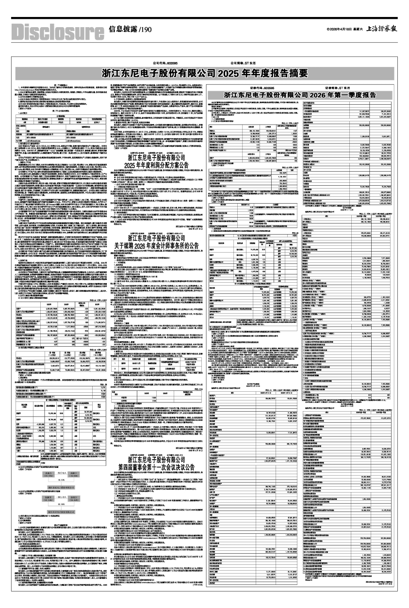 具体内容详见上海证券交易所网站(www.sse.com.cn)及《中国证券报》、《上海证券报》、《证券时报》、《证券日报》、《金融时报》、《经济参考报》和《中国日报》同日披露的《浙江东尼电子股份有限公司2025年年度报告》及其摘要。