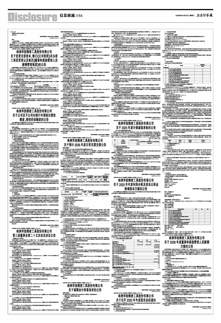 株洲华锐精密工具股份有限公司(以下简称“公司”)于2026年4月21日召开第三届董事会第二十五次会议,审议通过了《关于变更注册资本、修订〈公司章程〉并办理工商变更登记的议案》《关于制定并实施〈董事和高级管理人员薪酬管理制度〉的议案》,上述议案尚需提交公司股东会审议。现将有关情况公告如下: