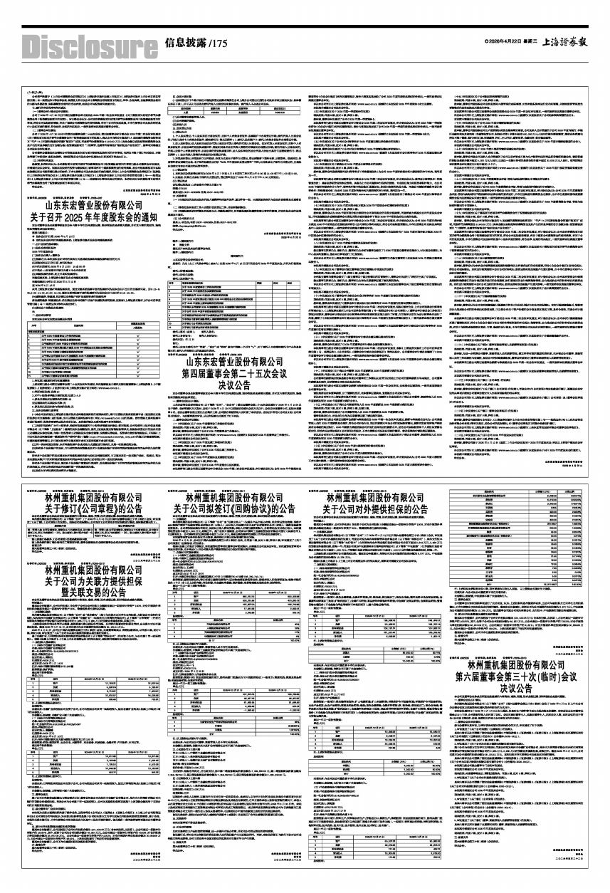 山东东宏管业股份有限公司(以下简称“公司”、“本公司”)第四届董事会第二十五次会议通知于2026年4月10日以电子邮件、电话等通讯方式发出,会议于2026年4月20日以现场结合通讯会议方式召开。会议应出席董事9名,实际出席董事9名。会议由董事长倪立营先生召集并主持,公司部分高级管理人员列席了本次会议。会议召开符合《公司法》及《公司章程》的规定。与会董事经过审议,以记名投票方式通过了如下决议: