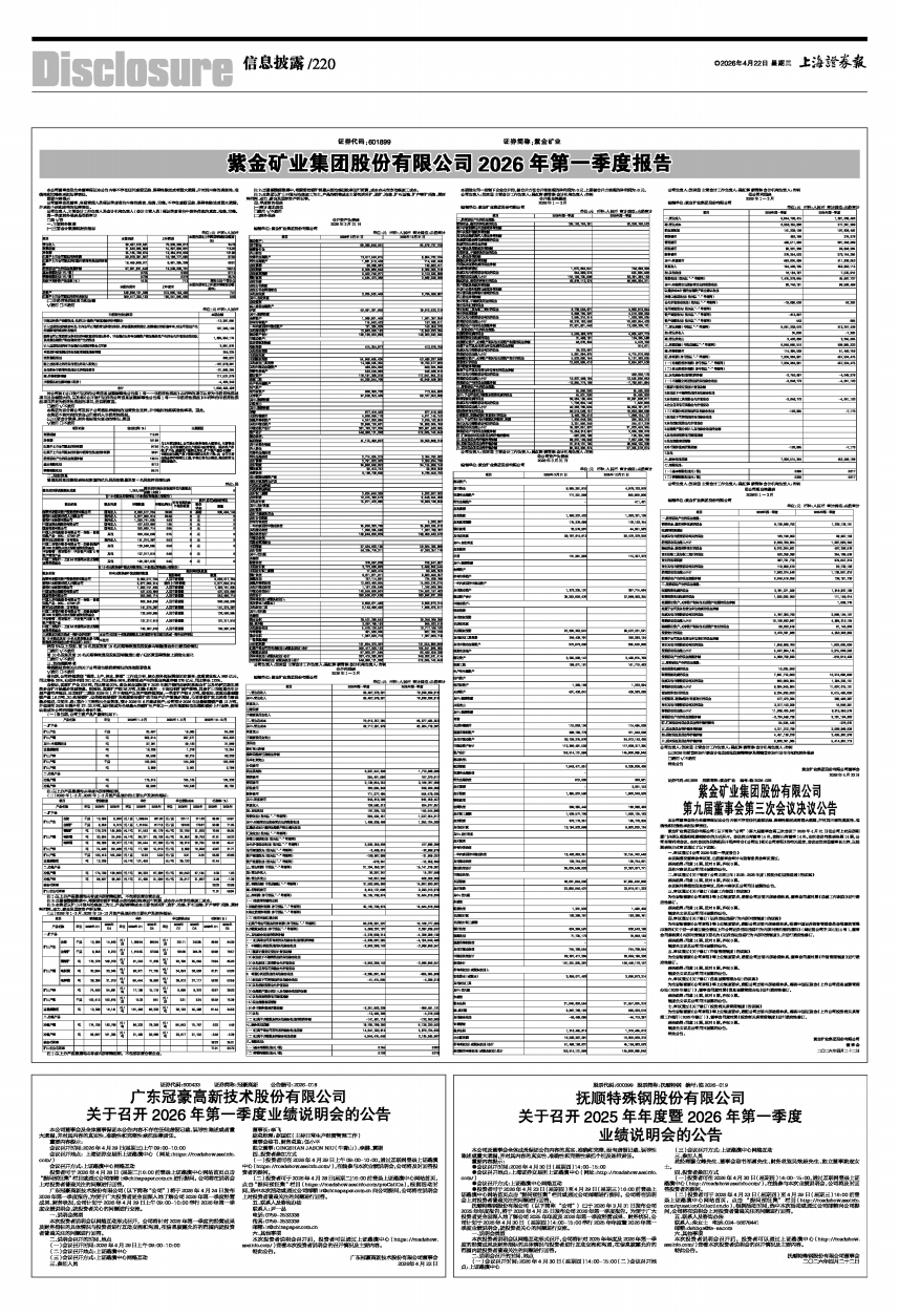 紫金矿业集团股份有限公司(以下简称“公司”)第九届董事会第三次会议于2026年4月21日在公司上杭总部和厦门分部以现场和视频相结合的方式召开。会议应出席董事14名,实际出席董事14名,本次会议有效表决票14票,公司高管列席会议。本次会议的召集和召开程序符合《公司法》和《公司章程》的有关规定,会议由邹来昌董事长主持,以投票表决方式审议通过了以下议案: