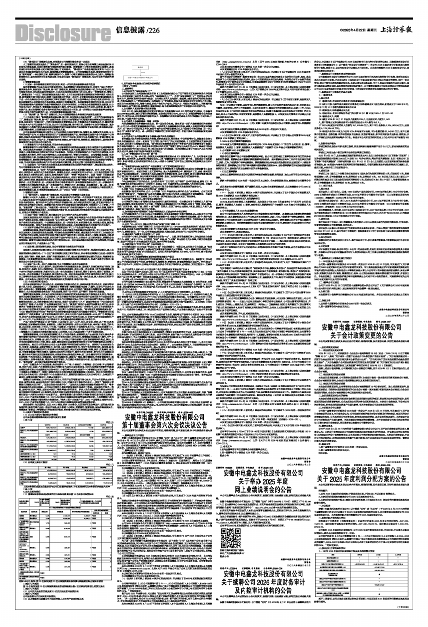 安徽中电鑫龙科技股份有限公司(以下简称“公司”或“本公司”)于2026年4月21日召开的第十届董事会第六次会议审议通过了《2025年度利润分配预案的议案》,并同意将该议案提交公司2025年度股东会审议。本次利润分配方案尚需提交公司2025年度股东会审议。