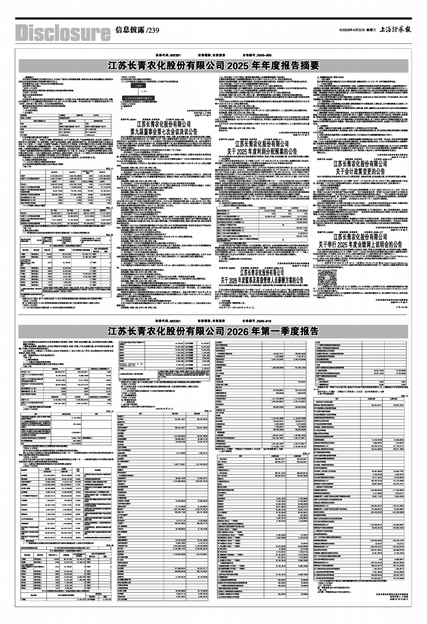 江苏长青农化股份有限公司(以下简称“公司”)《2025年年度报告及摘要》经公司第九届董事会第七次会议审议通过,并刊登在2026年4月22日的巨潮资讯网、《上海证券报》及《证券时报》上。