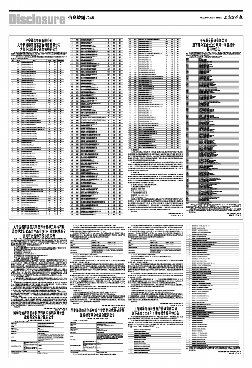 上海国泰海通证券资产管理有限公司旗下的72只基金2026年1季度报告全文于2026年4月22日在本公司网站(http://www.gthtzg.com)和中国证监会基金电子披露网站(http://eid.csrc.gov.cn/fund)披露,供投资者查阅。如有疑问可拨打本公司客服电话(95521)咨询。具体基金明细如下:
