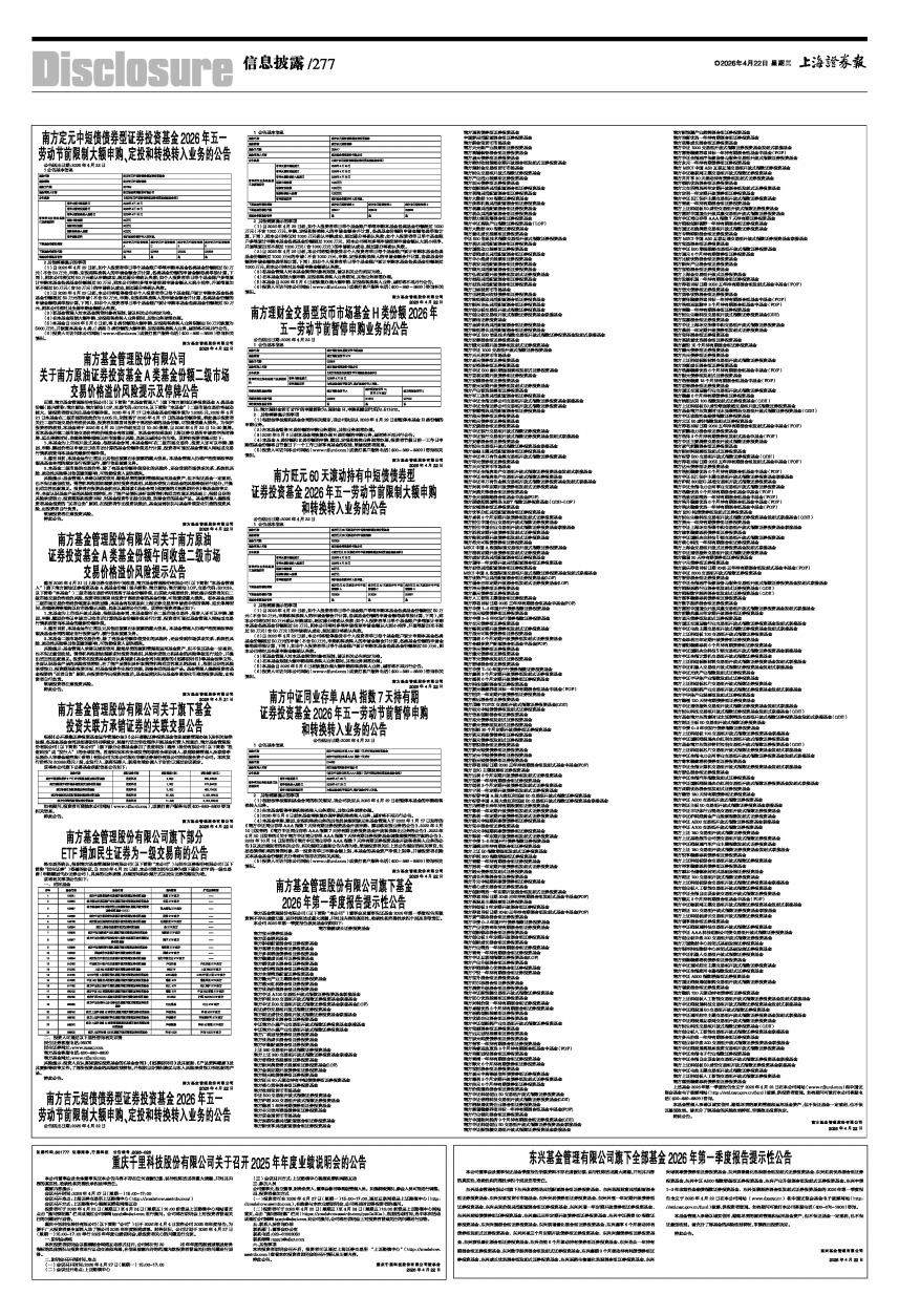 近期,南方基金管理股份有限公司(以下简称“本基金管理人”)旗下南方原油证券投资基金A类基金份额(场内简称:南方原油;南方原油LOF,交易代码:501018,以下简称“本基金”)二级市场交易价格波动较大,请投资者密切关注基金份额净值。2026年4月17日本基金基金份额净值为1.6265元,2026年4月21日本基金在二级市场的收盘价为2.005元,明显高于2026年4月17日的基金份额净值。特此提示投资者关注二级市场交易价格溢价风险,投资者如果盲目投资于高溢价率的基金份额,可能遭受重大损失。为保护投资者的利益,本基金将于2026年4月22日开市起至当日10:30停牌,自2026年4月22日10:30复牌。若本基金后续二级市场交易价格溢价幅度未有效回落,本基金有权采取向上海证券交易所申请盘中临时停牌、延长停牌时间、连续停牌等措施以向市场警示风险,具体以届时公告为准。现特向投资者提示如下: